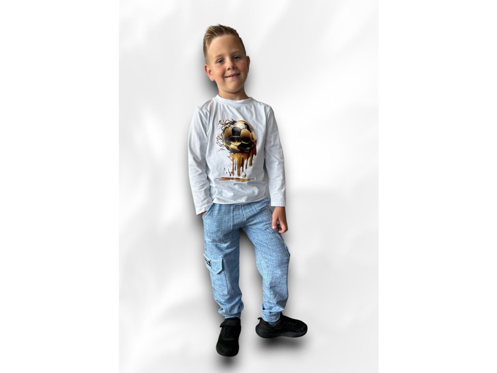 Štýlové chlapčenské kapsačové tepláky s prednými vreckami v modernom denim vzhľade. Vďaka elastickému pásu s gumou perfektne sedia aj na štíhle deti. Vyrobené z pohodlného teplákového materiálu, ktorý je mäkký a príjemný na nosenie.