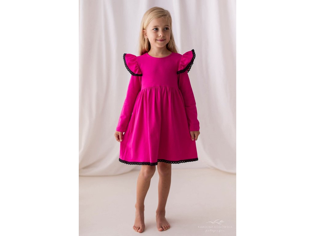 Dievčenské šaty Lily Grey vo výraznej fuchsiovej farbe sú dokonalou kombináciou jednoduchosti a originality. Majú dlhý rukáv a ozdobný volán s čiernou krajkou, ktorý im dodáva elegantný nádych. Vyrobené z príjemného materiálu 95 % bavlna, 5 % elastan – pohodlné na nosenie počas celého dňa. Krásny kúsok pre malé parádnice.